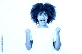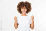 Happy young dark skin woman isolated on white background in tshirt clothes. Copy space. Mock up. White template blank summer t shirt. Curly hair girl