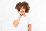 Beautiful young african american woman isolated on white background. Copy space. Mock up. Skin care, spa and make up concept. Summer time. Afro girl curly hair