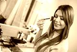 Portrait of beautiful young woman applying makeup using a makeup brush near mirror