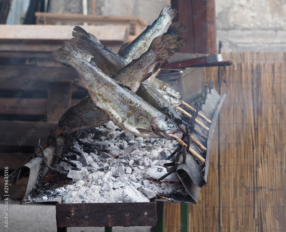 Trouts smoked and grilled vertically with wooden skewers over the grill, in an ancient way.