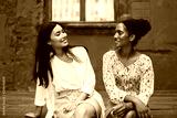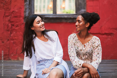 Two pretty smiling girls happily looking at each other while spending time together in cozy courtyard
