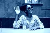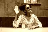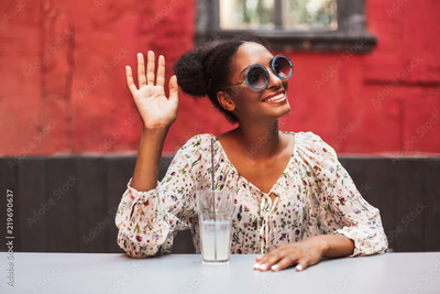Smiling african lady in blouse and sunglasses happily waving while looking aside with cocktail in cozy courtyard of cafe