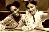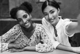 Two cheerful girls happily taking photos together while spending time in courtyard of cafe