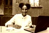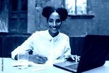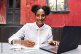 Beautiful smiling african girl in white shirt happily looking in camera working with laptop in courtyard of cafe