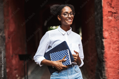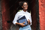 Nice african girl in eyeglasses and shirt holding laptop and notepad in hands joyfully looking in camera