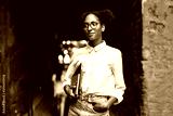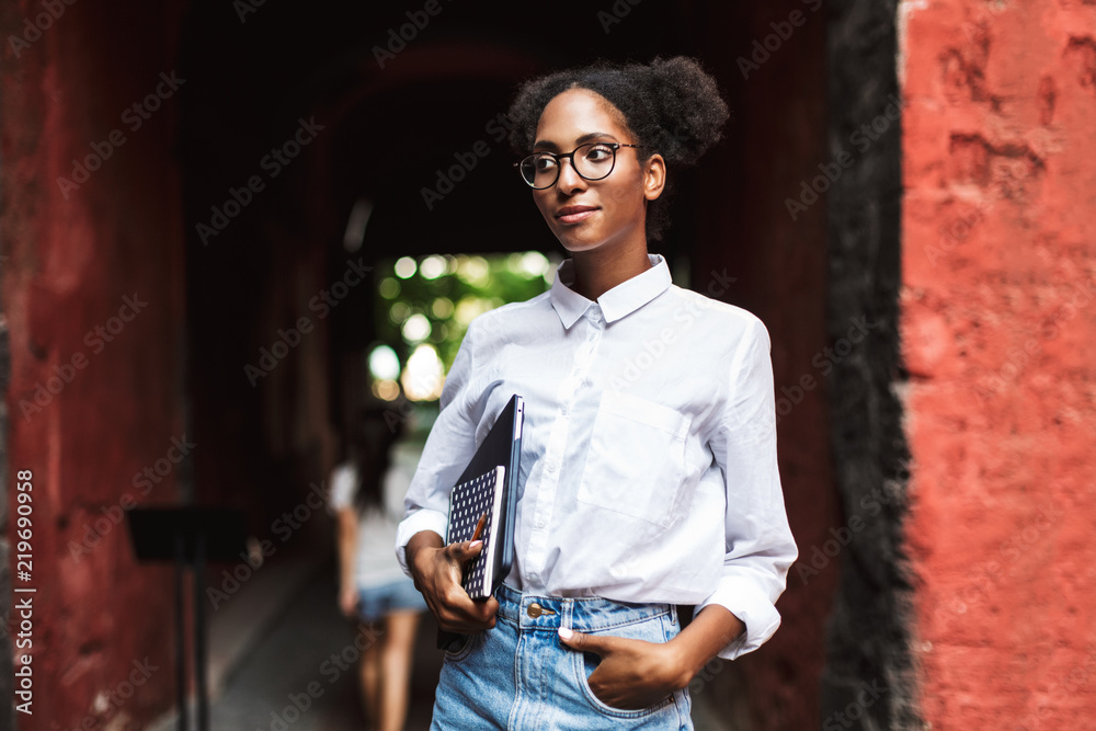 Pretty african girl in eyeglasses and shirt holding laptop and notepad in hands while thoughtfully looking aside outdoor