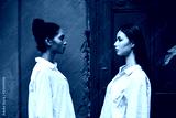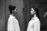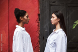 Young beautiful women in white shirts thoughtfully standing opposite each other
