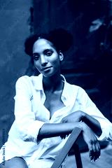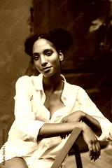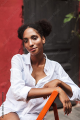 Pretty african lady with dark curly hair in white shirt dreamily looking in camera