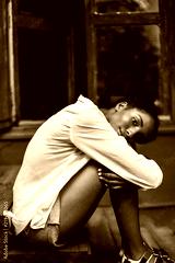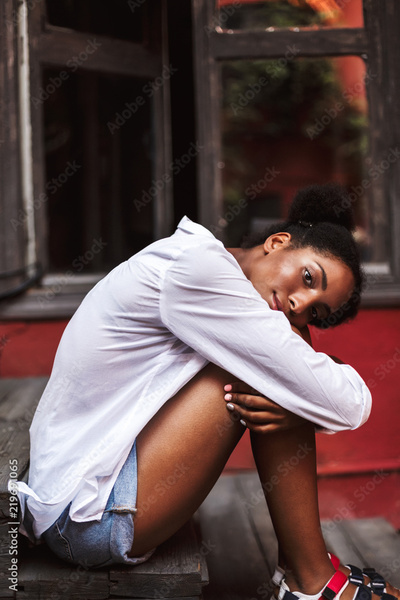 Beautiful african girl with dark curly hair in white shirt leaning on knees dreamily looking in camera with window on background