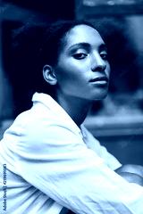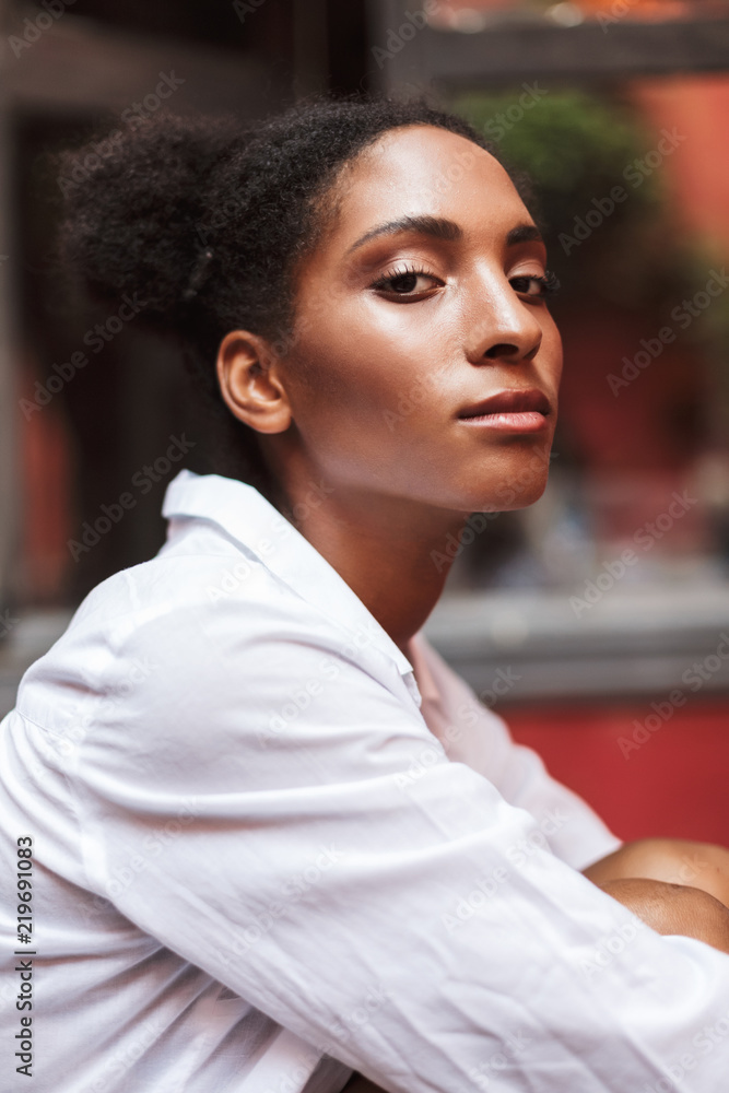 Portrait of beautiful african girl with dark curly hair in white shirt thoughtfully looking in camera