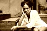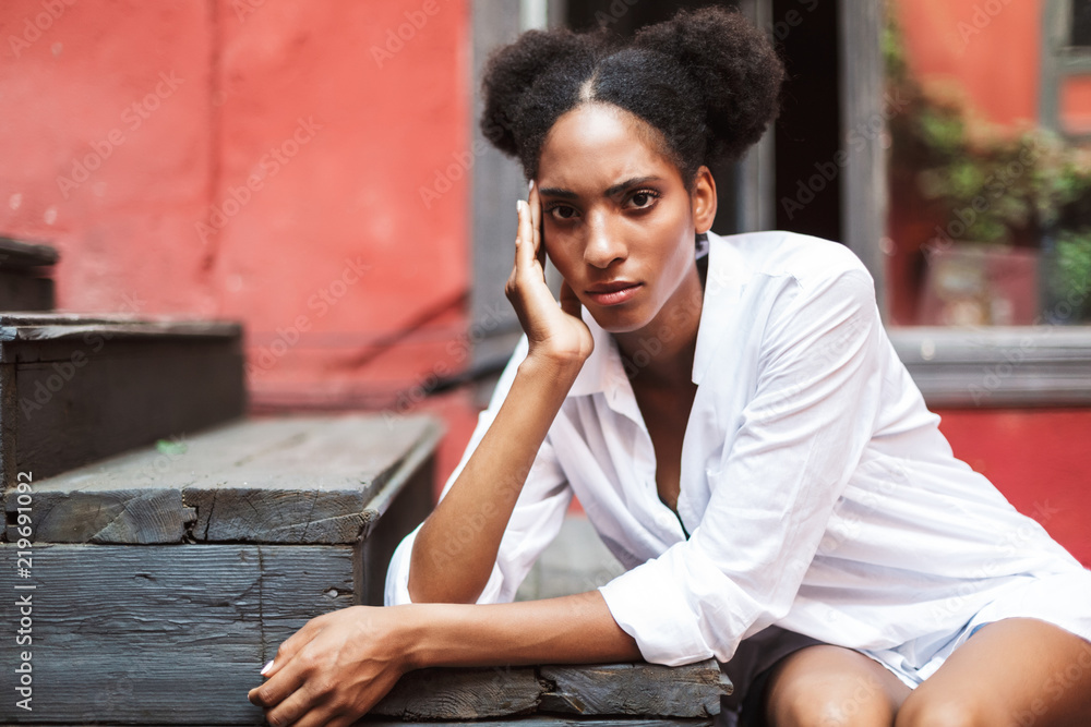 Beautiful african girl with dark curly hair in white shirt thoughtfully looking in camera while leaning on stairs in old courtyard