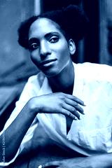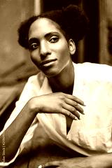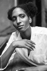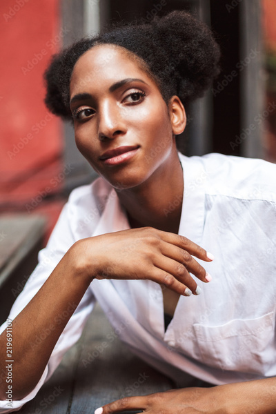 Portrait of beautiful african lady with dark curly hair in white shirt dreamily looking aside