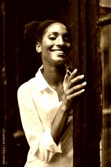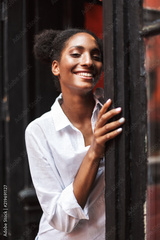 Cheerful african girl with dark curly hair in white shirt happily looking in camera