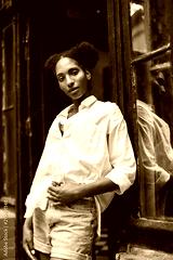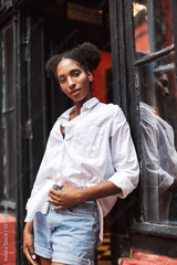 Beautiful african girl with dark curly hair in white shirt and denim shorts dreamily looking in camera while leaning on old black door
