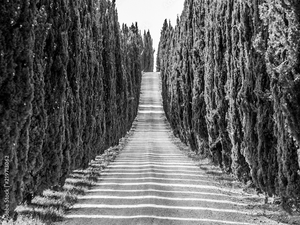 Cypress alley with rural country road, Tuscany, Italy. Black and white image.