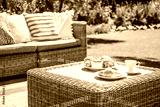 Beige color wicker table and settee on a porch during sunny afternoon in the garden. Croissants and coffee served on the table.