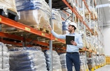 logistic business, shipment and people concept - businessman in helmet with clipboard checking goods at warehouse