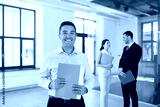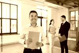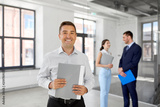 real estate business, sale and people concept - happy smiling realtor or businessman with folder and customers at new office room