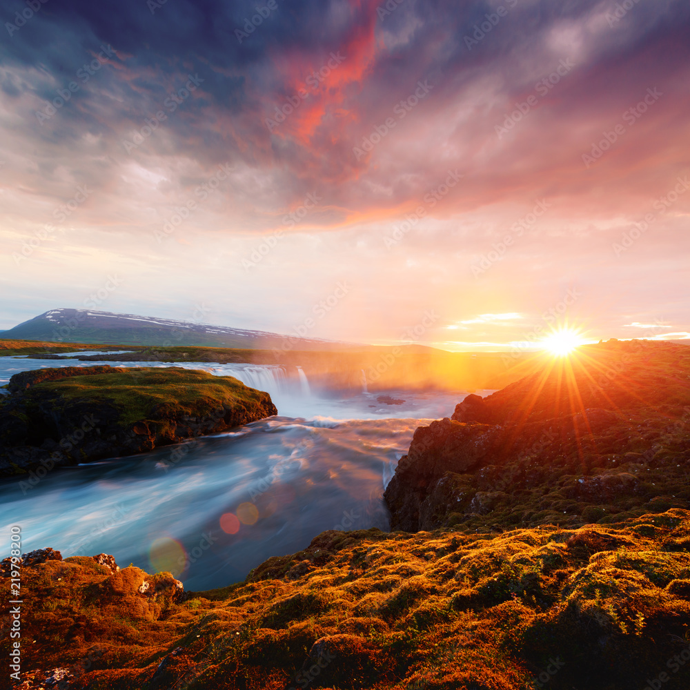 Colorful sunrise on Godafoss waterfall on Skjalfandafljot river, Iceland, Europe