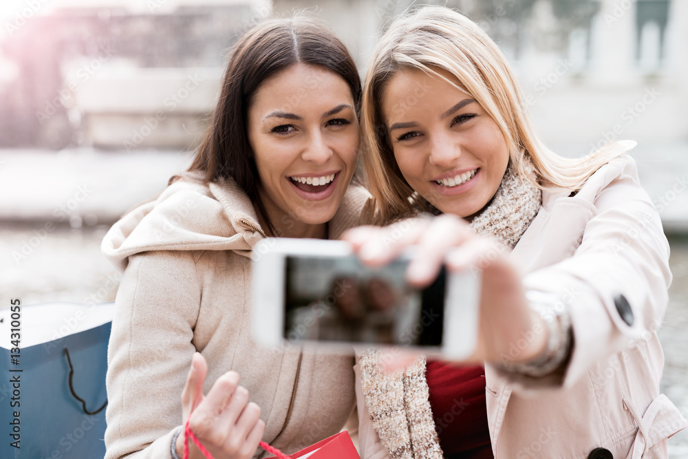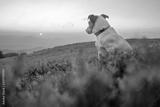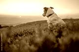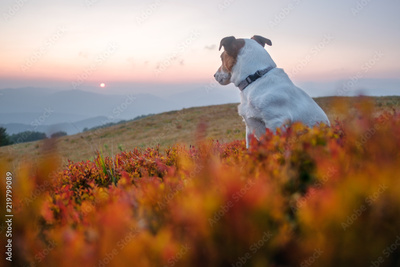 Alone white dog sitting in the red grass against the backdrop of an incredible sunrise mountain landscape