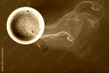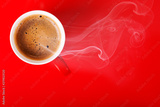 Fragrant coffee on a red background for your advertising. Smoke from hot coffee.