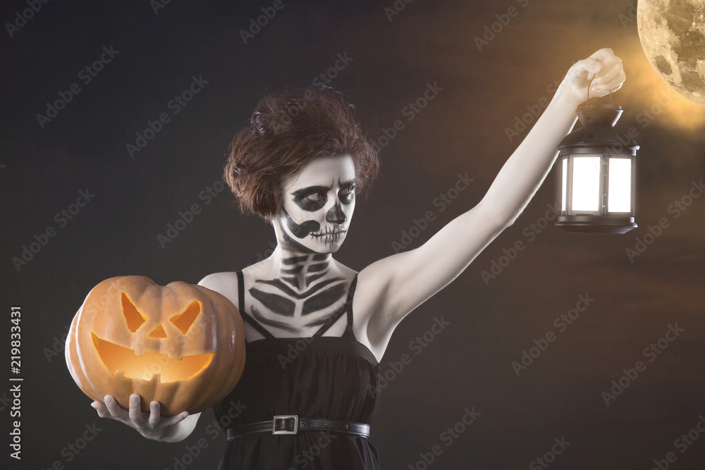 woman monster. Creative dark make-up, conceptual idea for Halloween. Eerie nightmare turning into a black vampire, volume spikes body art painting. Professional photo darkness background horizontal