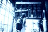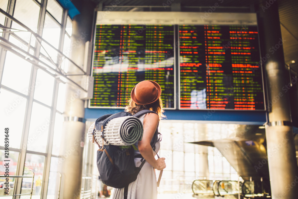 Theme travel public transport. young woman standing with back in dress and hat behind backpack and camping equipment for sleeping, insulating mat looks schedule on scoreboard airport station