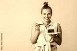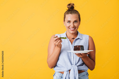 Cheerful woman in shirt joyfully looking in camera holding plate with slice of chocolate cake in hands over yellow background isolated. Plus size model