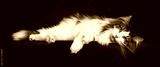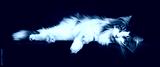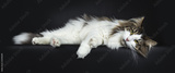 Handsome lazy black tabby with white Norwegian Forest cat laying side ways with head on surface looking straight at lens, isolated on black background