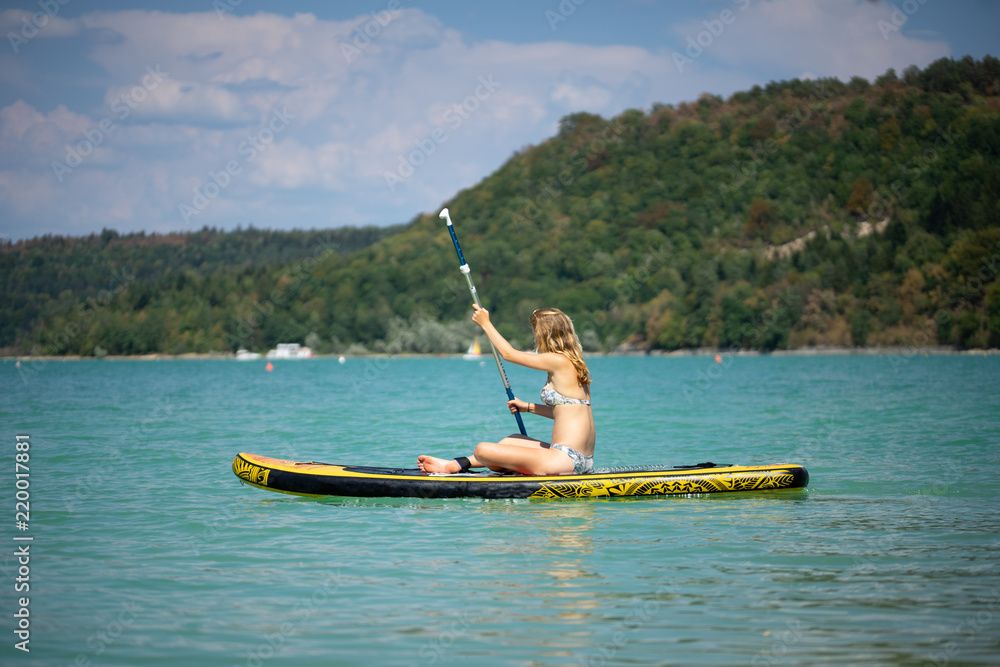 une jeune femme blonde de profil, rame sur un paddle, assise.