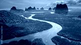 Aerial drone view of beautiful mangrove forest leading to distant, towering limestone karsts (Phang Nga, Thailand)