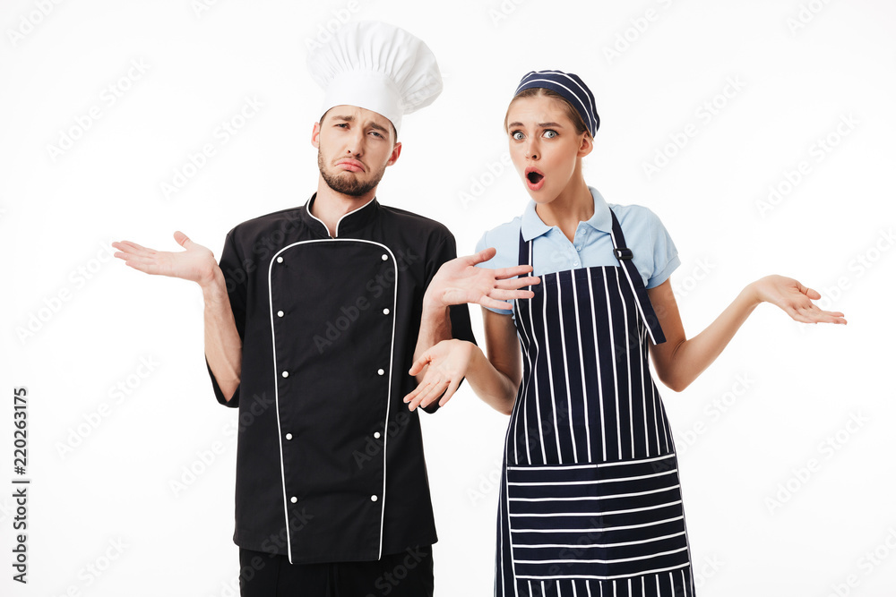 Young upset man chef in black uniform and white hat and woman cook in striped apron and cap amazedly looking in camera over white background isolated