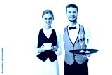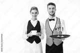 Young smiling waiter holding tray with glasses of champagne while pretty waitress holding cup of coffee in hands happily looking in camera together over white background isolated