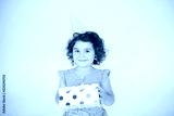 Beautiful smiling little girl with dark curly hair in dress and birthday cap happily looking in camera with gift box in hands over white background