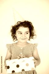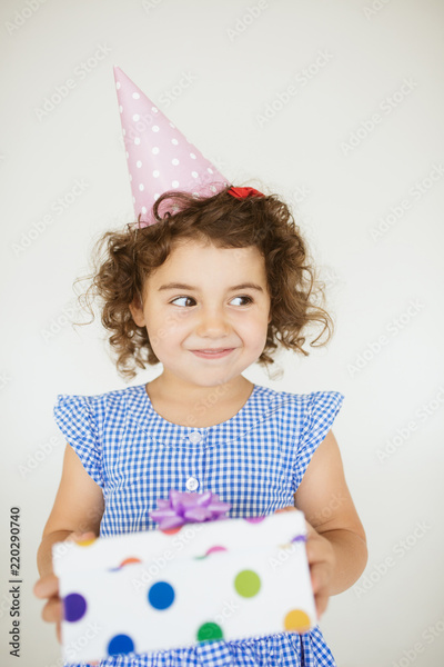 Pretty smiling little girl with dark curly hair in dress and birthday cap dreamily looking aside with gift box in hands over white background