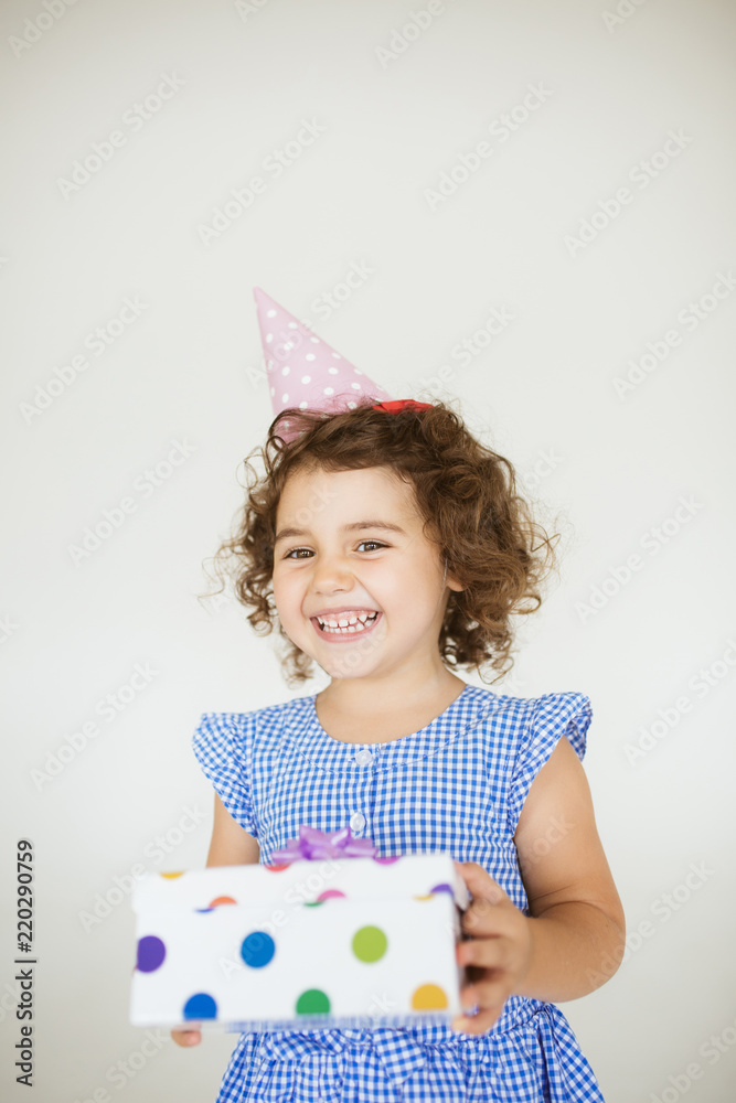 Joyful little girl with dark curly hair in dress and birthday cap happily laughing with gift box in hands over white background
