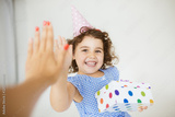 Beautiful little girl with dark curly hair in blue dress and birthday cap joyfully looking in camera while giving high five with gift box in hand over white background
