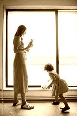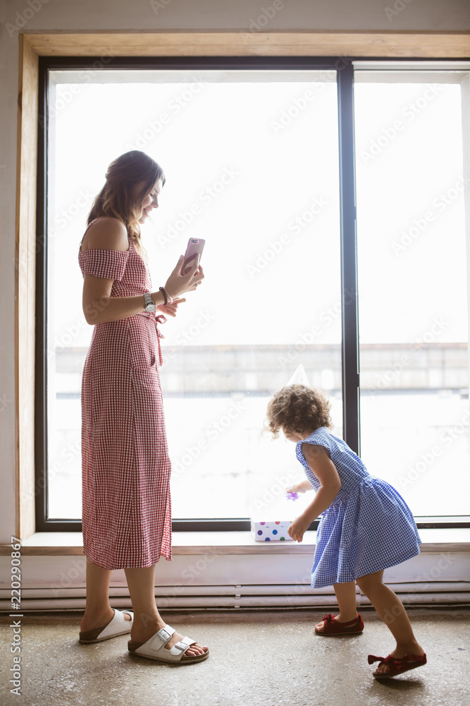 Beautiful woman in dress happily taking photos on cellphone of her little cute daughter with window on background