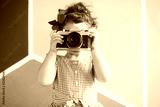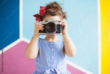 Pretty little girl with dark curly hair in dress playfully covering her face with retro camera over colorful background