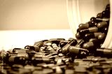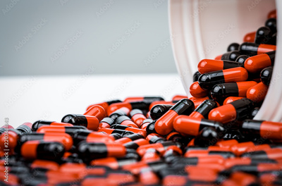 Capsules pill spilled out from white plastic bottle container. Prescription drug. Antibiotics drug resistance. Antimicrobial capsule pills. Pharmaceutical industry. Pharmacy background. Antimicrobial.