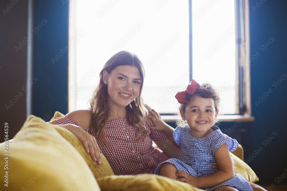 Beautiful smiling mother with her little cute daughter in blue dress happily looking in camera while spending time together on sofa at home with big window on background