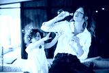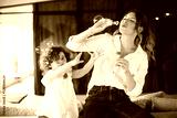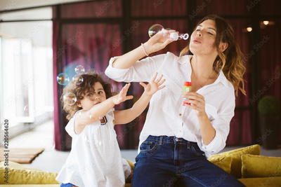 Beautiful young mother in white shirt with little cute daughter in dress happily blowing bubbles while spending time together at home