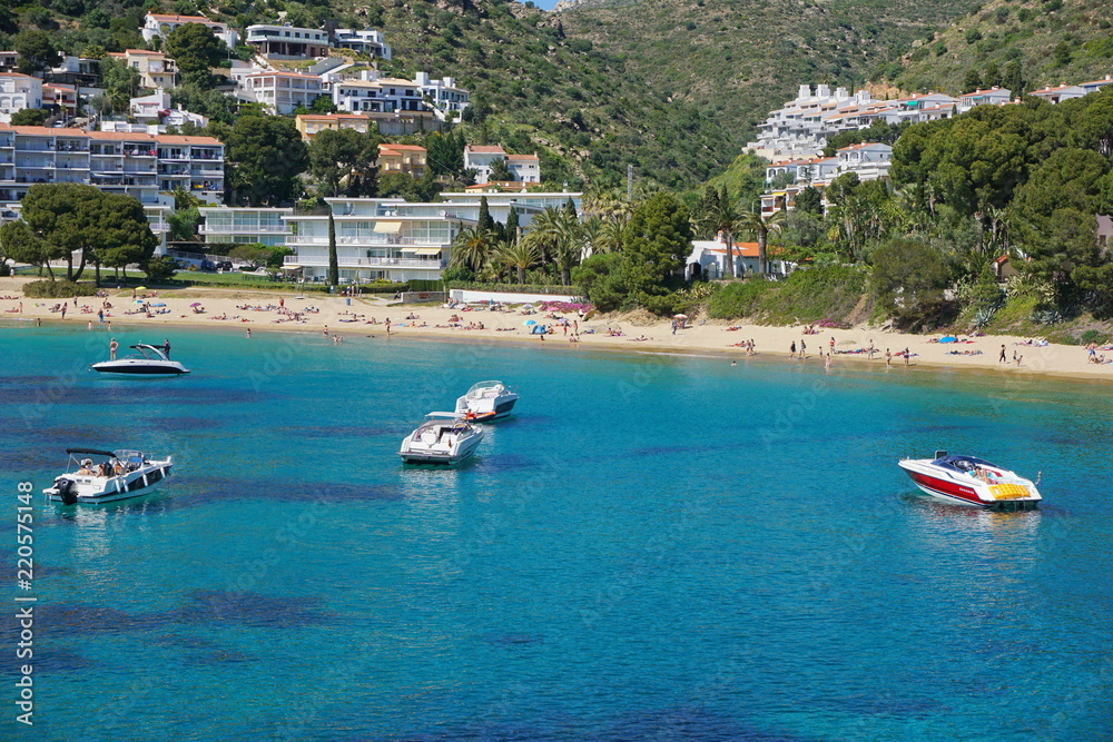 Spain Costa Brava coastline, sandy beach with boats anchored near the shore, Mediterranean sea, playa Almadrava, Canyelles Grosses, Roses, Girona, Catalonia