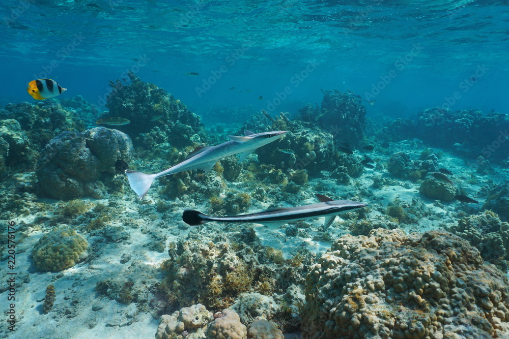 Underwater two remora fish, live sharksucker, Echeneis naucrates, with corals in the lagoon, Pacific ocean, French Polynesia