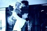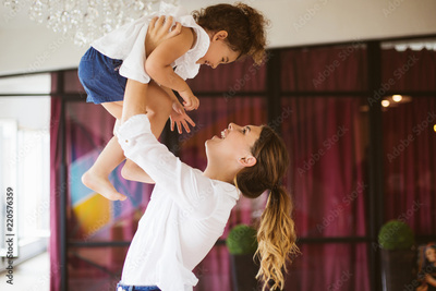 Cheerful mother in white shirt happily holding little cute daughter in hands while spending time together at home