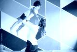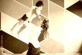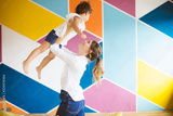 Young mother in white shirt joyfully lifting little pretty daughter up while spending time together at home with colorful wall on background