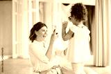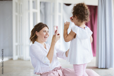 Cheerful mother joyfully taking photos on cellphone of pretty little daughter wearing adult sunglasses while spending time together at home
