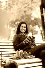 Young smiling woman with cup of tea in autumn park