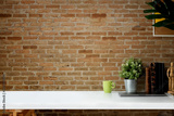 Mockup workspace vintage books, dry flower, office stationery and cork frame over red brick wall.
