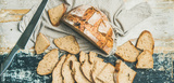 Flat-lay of freshly baked sourdough wheat bread loaf halved and cut in slices over linen napkin and rustic table background, top view, wide composition